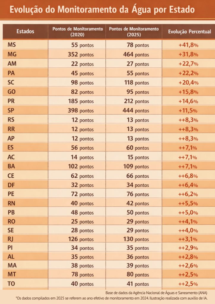 Nossa análise da evolução do monitoramento da água mostra que nos últimos quatro anos registrados a maioria dos estados ampliaram seus pontos a taxas menores que 2% ao ano. Entre 2023 e 2024, a última comparação disponível, houve até mesmo redução no total de pontos monitorados no País segundo os dados da reguladora. O Rio de Janeiro, um dos estados com problemas mais graves de segurança hídrica, aumentou sua rede monitorada em menos de 1% ao ano de 2020 a 2024, e reduziu em mais de 10% no último ano.